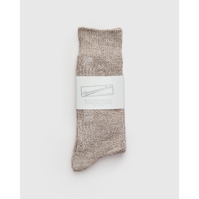 DetailsSizingBrand InfoThe Linen Sashiko Crew socks from AnonymousIsm are soft full-length made from a unique blended yarn, woven with a special jacquard knit to emulate sashiko pattern garments. The dry texture of linen makes for a lightweight, breathable