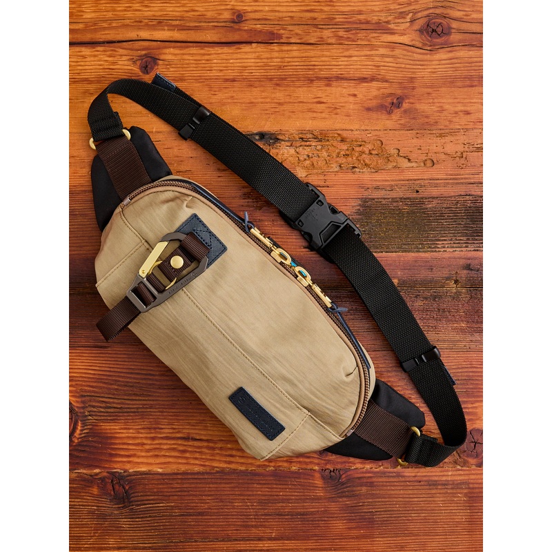 • The Link series from Master-Piece are crafted using a processed nylon twill fabric and come fitted with a large carabiner at the front. The bags feature water-resistant processing throughout. The bag features a large central compartment and hidden interior pocket for added security.