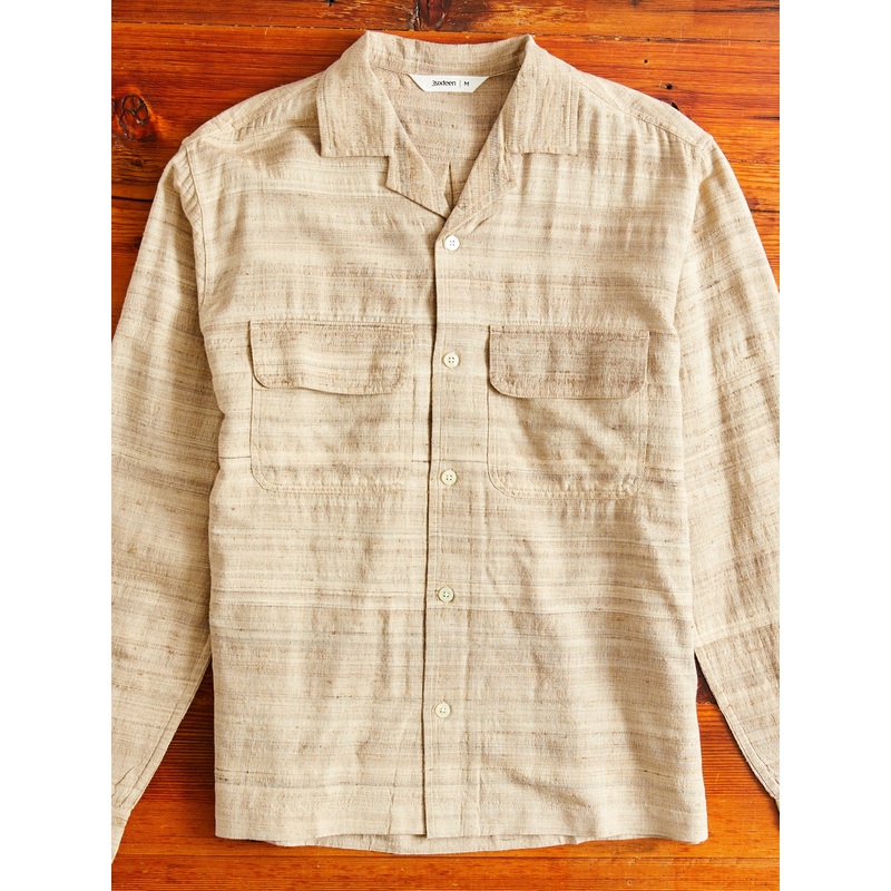 DetailsSizingBrand InformationThe Long Sleeve Open Collar Shirt from 3sixteen takes cues from mid-century loungeshirting, cut in amodern boxy fit. 3sixteen outfits the shirt with a raw silk fabric that is loomed by hand with a streaky, slubby effect that m