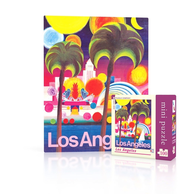 Set on the blue water, Los Angeles’ iconic buildings as well as famous palm trees are colorfully illustrated in this 100 piece mini puzzle.