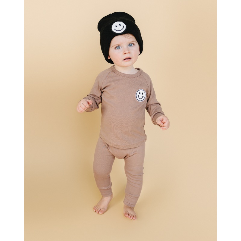 This two-piece set is crafted from oh-so-soft cotton, making it perfect for daily lounging! Stylish enough for outings yet cozy and comfortable for play, its an essential for any wardrobe. The fun smiley patch adds a quirky touch to this must-have piece. G