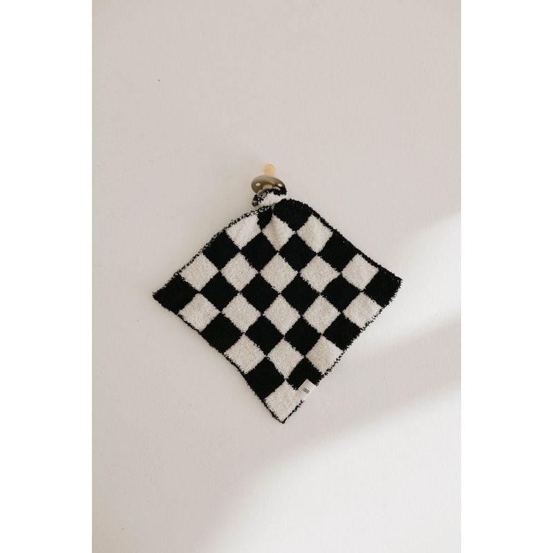 The softest lovey made of microfiber feather yarn. Featured in a classic black and white checkerboard pattern.