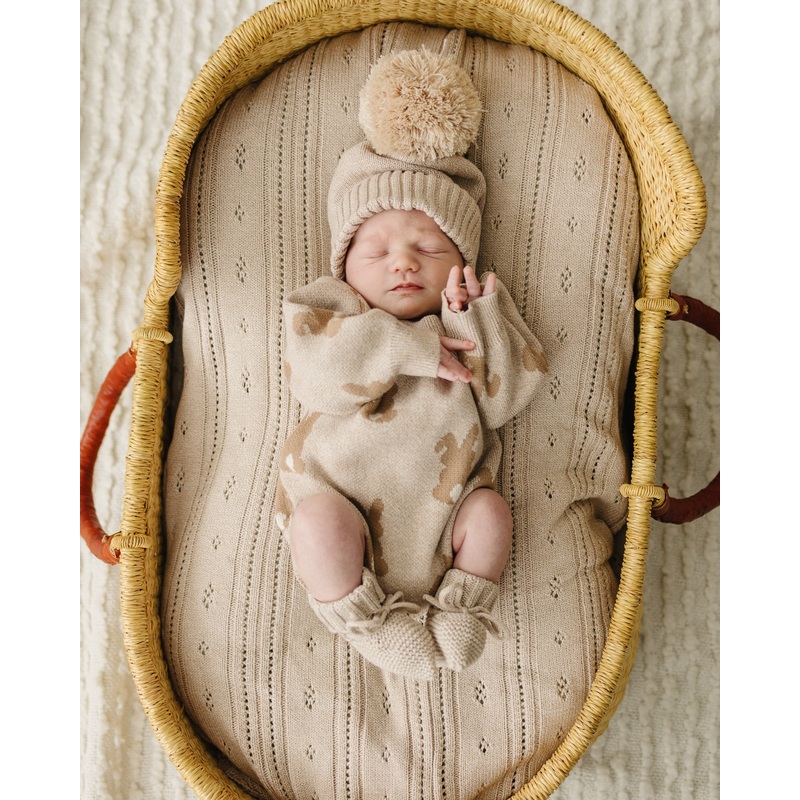 The Luna + Luca Bunny Jacquard Romper pairs well with our Luna + Luca Organic Booties and Pom Beanies in both Heather Beige.