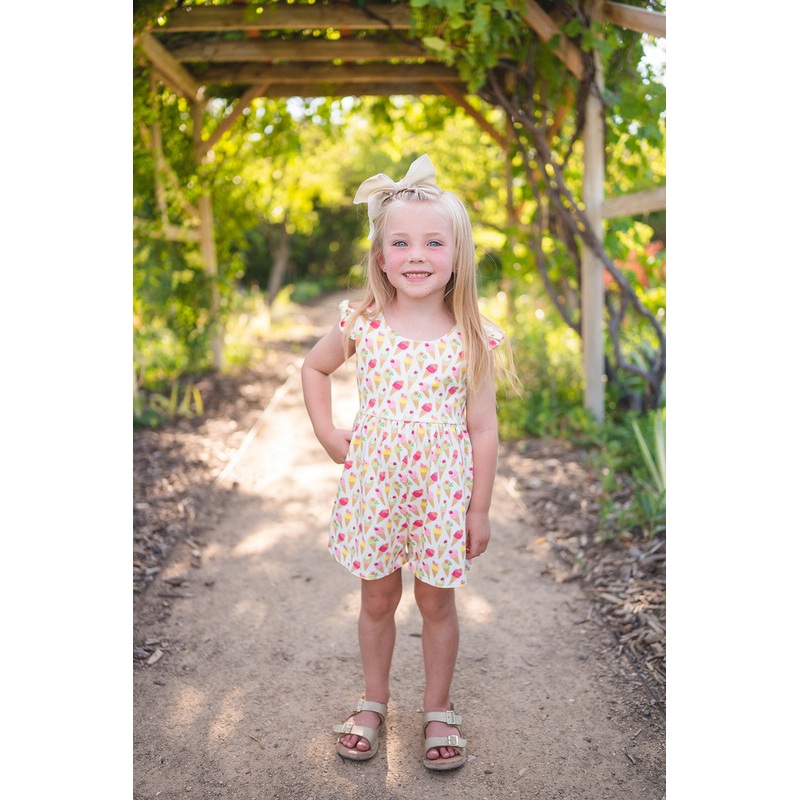 Made for cartwheels and jump rope - this romper was inspired by adventurous girls! Featuring a ruffled detail on the shoulder, mid length shorts with side seam pockets in our signature extra soft and stretchy cotton fabric.Featuring our Ice Cream Scoop all