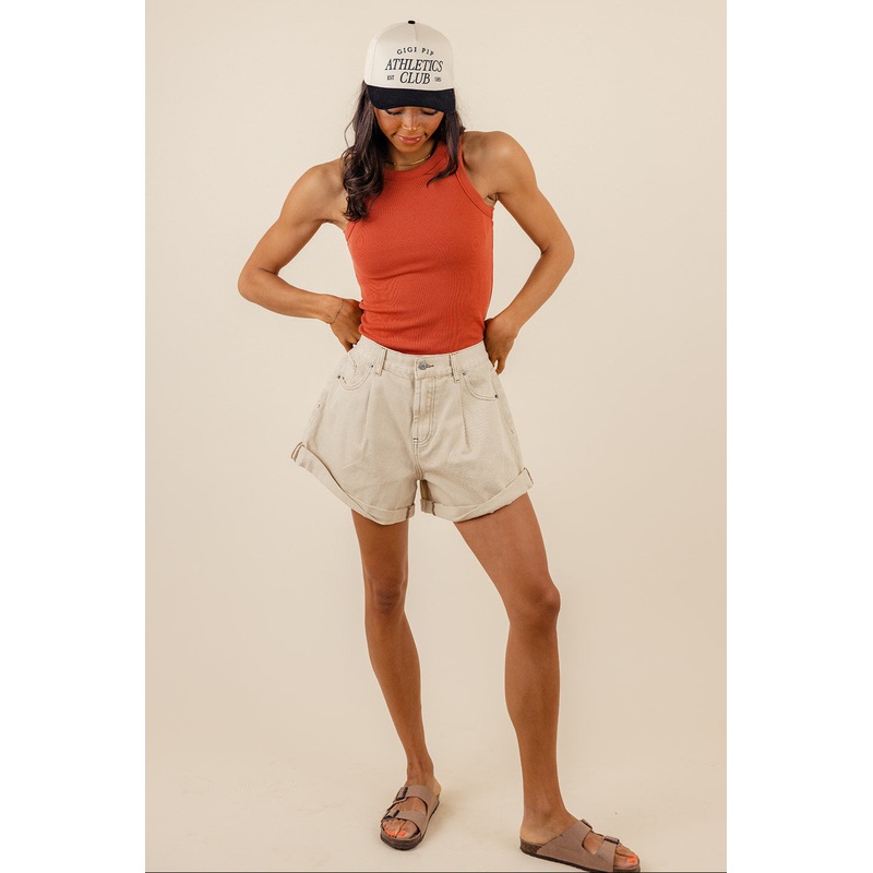 tomato // paired with the athletics club vintage trucker in black + sonny pleated shorts