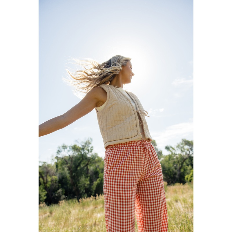 This slightly cropped vest has a cute front tie closure, making it easy to style. In a neutral color, it pairs perfectly with anything in your closet. Wear it with a tank or layer it up for a trendy look that's both comfy and chic!adjustable tie// paired w