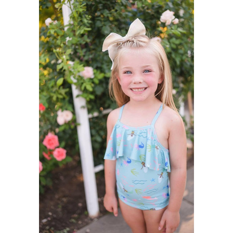 This fun one piece suit features a wrap around ruffle detail, adjustable straps, beige lining and a fitted bodice with UPF 50 fabric in the perfect print for mermaid lovers!