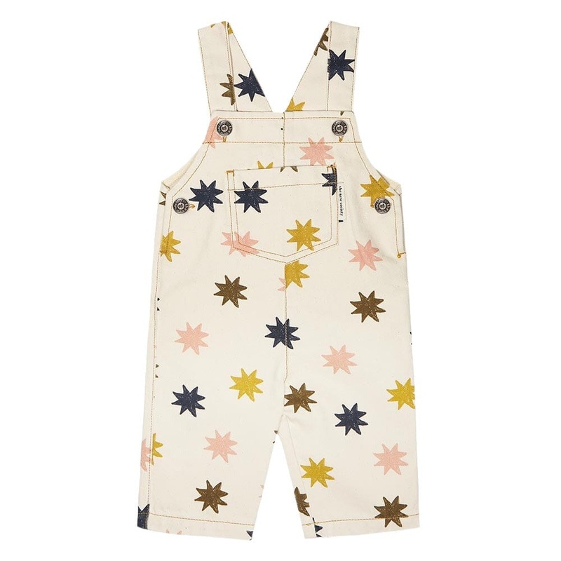 Denim overalls with The New Society’s Stars Print, TNS denim buttons, and front pocket.
