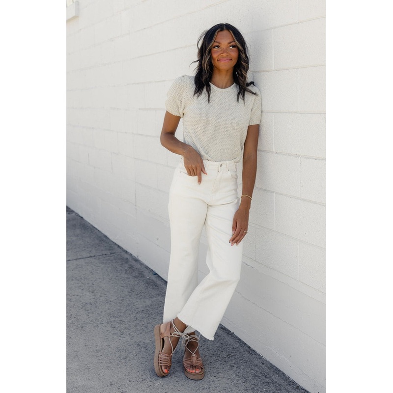 This sweet piece features a playful open-knit design, cute puff sleeves, and a charming round neckline. Perfect for sunny days and cozy nights. It’s only a matter of time until this becomes your new favorite closet staple!