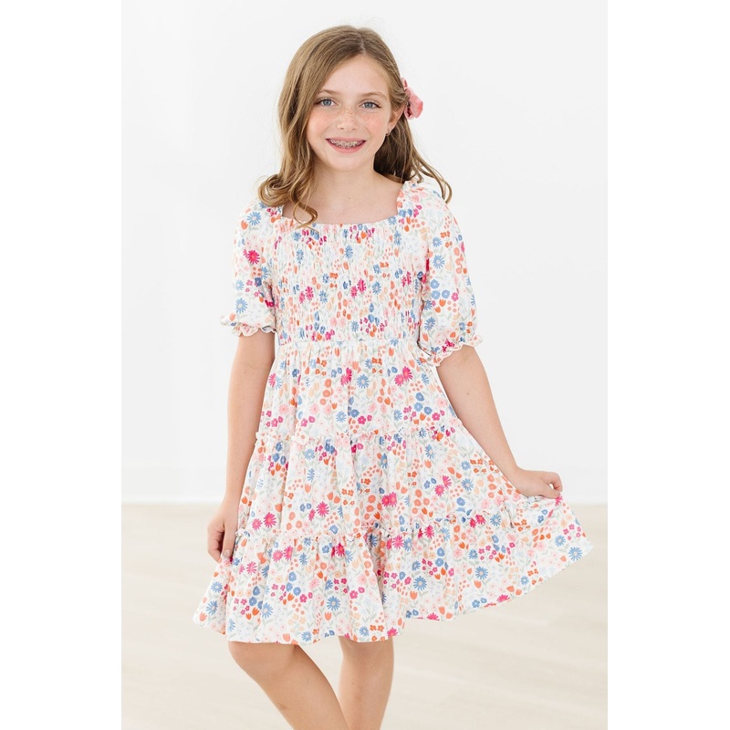 Our Smocked Ruffle Dress is Mila's new favorite dress. From the moment she tried on the first sample, she didn't want to take it off. She even wore the sample to school the next day. Smocked bodice is comfortable and stretchy. Ruffle skirt makes this dress