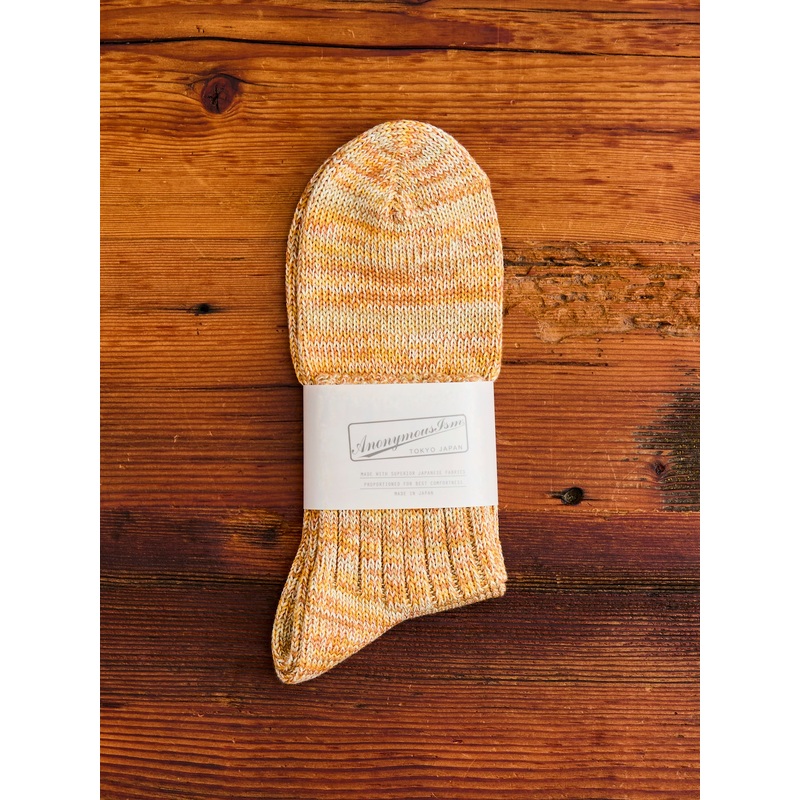 • The Melange socks from AnonymousIsm are softquarter-length socks made from multi-colored melange yarn. The socks are woven using the brand’s signature slub weave, which adds texture and pliability. Each pair of AnonymousIsm socks are expertly crafted by their team in Tokyo, Japan.
