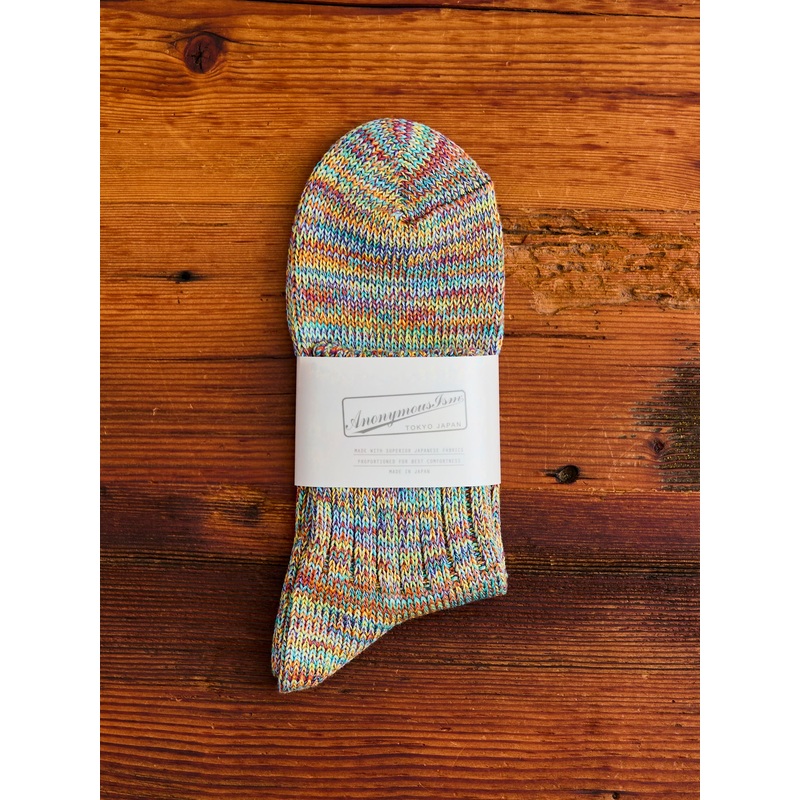 • The Melange socks from AnonymousIsm are softquarter-length socks made from multi-colored melange yarn. The socks are woven using the brand’s signature slub weave, which adds texture and pliability. Each pair of AnonymousIsm socks are expertly crafted by their team in Tokyo, Japan.