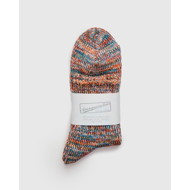 • The Melange socks from AnonymousIsm are softquarter-length socks made from multi-colored melange yarn. The socks are woven using the brand’s signature slub weave, which adds texture and pliability. Each pair of AnonymousIsm socks are expertly crafted by their team in Tokyo, Japan.
