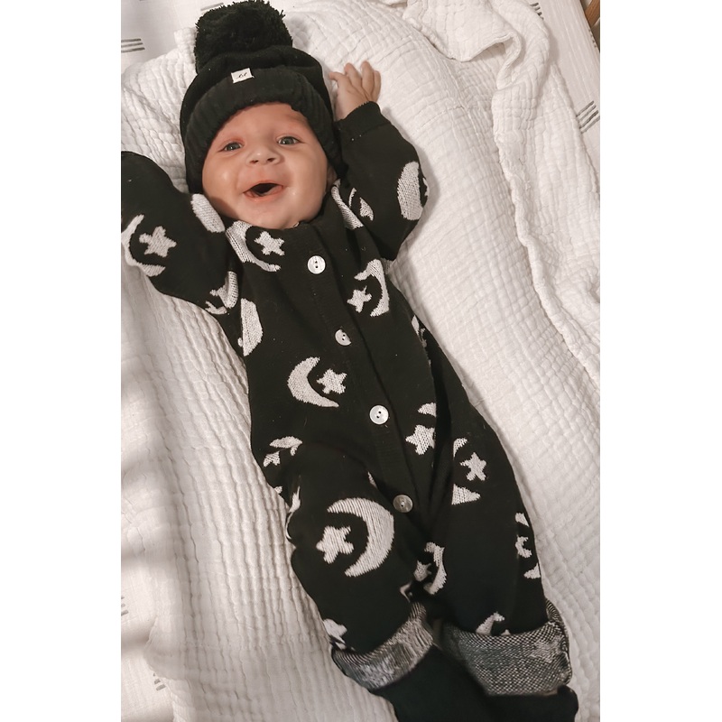 Shoot for the stars or just reach for the pacifier. Our Midnight Moon & Stars Knit Jumpsuit wraps your little one in a celestial dreamjacquard moons and stars twinkle across cozy black knit, while pearly buttons add a touch of fancy. Perfect for naps, playtime, or pretending to be an actual tiny astronaut. Warning: may cause uncontrollable aww from everyone who sees it.