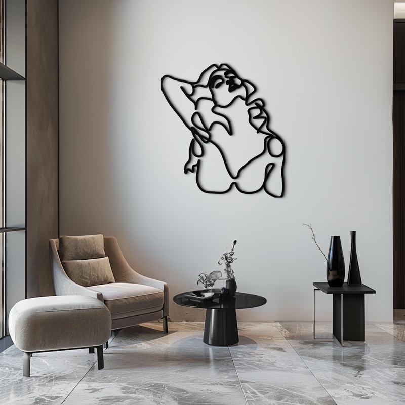 Add a touch of modern elegance with this Minimalist Woman Metal Wall Art, crafted from 1.5 millimeter premium steel and electrostatically painted for a durable, rust-resistant finish. This artistic steel wall sculpture captures fluidity and emotion in a single-line abstract silhouette, making it an eye-catching piece for any space.