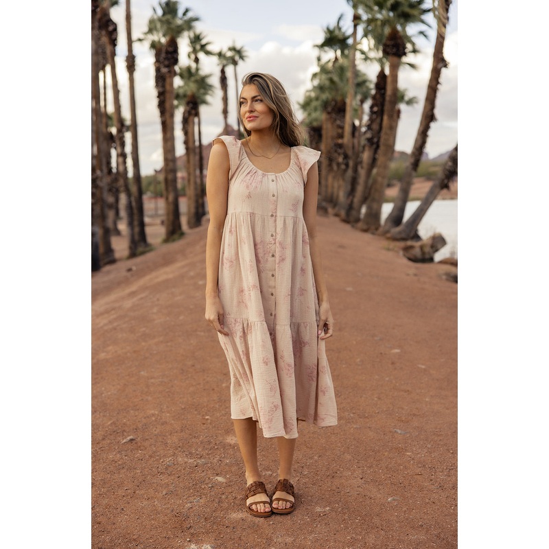 Picture this: a sunny day, a gentle breeze, and you in this dress!Designed with flutter sleeves, an elastic boat neckline, and full-length buttons, this dresswill take you straight from the beach to a night out on the town.