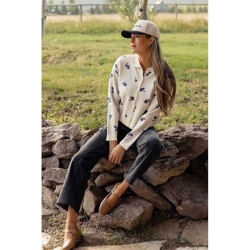 This soft and cozy collared cardigan features blue floras and and flattering fit. We love it worn buttoned up like a sweater, but you can throw it over a dress, jeans, or whatever you please!functional buttons// paired with the free people risk taker strai