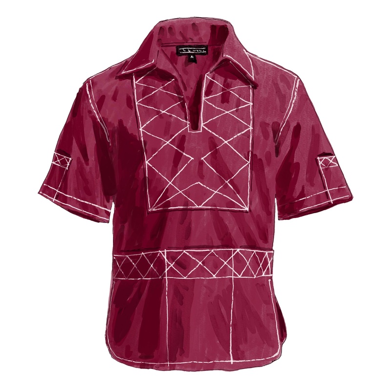 Morning Market Shirt (No. J8181). The wide, relaxed V-neck collar is your first clue to the DNA of this shirt. Handsome decorative stitching steals the show, but reinforced shoulder seams make this a workhorse of a shirt. Three vast pockets across the front mean you can stash your gardening tools or harvest a half dozen avocados at the Montecito house and leave your hands free. One more pocket on each sleeve. Side vents and curved shirttail hem. Imported.