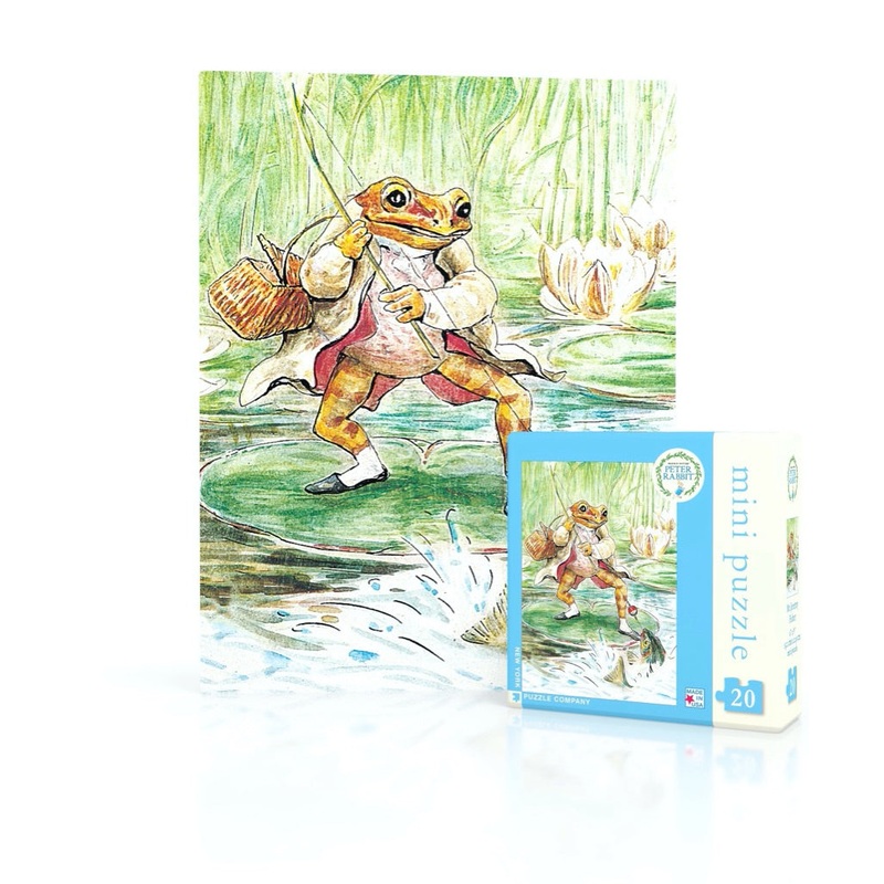 From Beatrix Potter’s classic, Mr. Jeremy Fisher the frog leaves his home to go fishing for minnows on a lily leaf. He encounters two much bigger fish which cause him some problems.