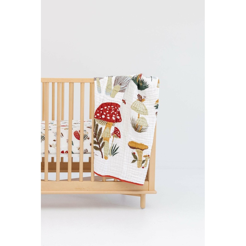 On one side of our Mushroom Quilt you’ll find an assortment of the cutest mushrooms nursery design you can forage and on the other, a cheerful and rusty red color.
