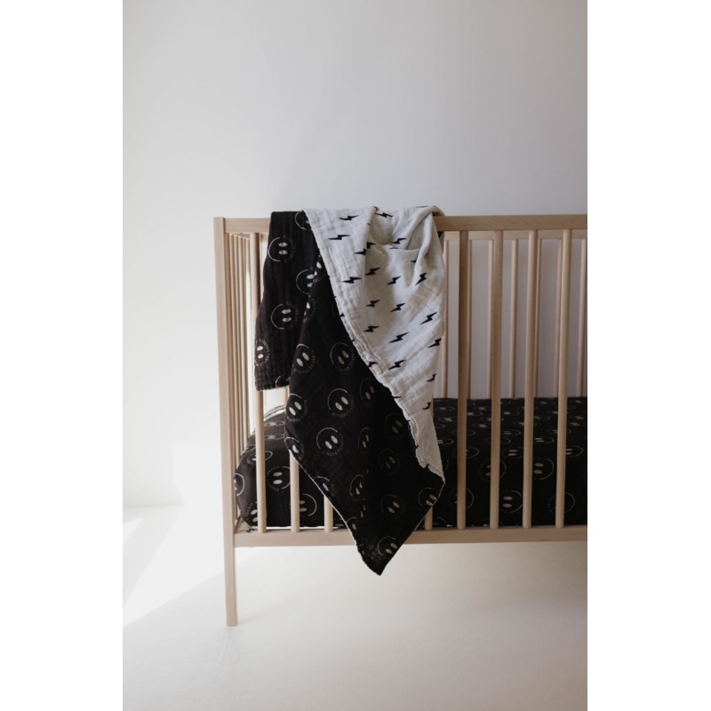 Cozy and stylish, the FF Smile / Black & White Bolt Reversible Muslin Quilt has 6 layers of soft muslin material that become even softer with each wash. Enjoy a reversible design featuring a classic black and white lightning bolt pattern and a Forever Fren