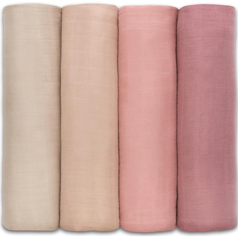 Muslin Swaddle Blankets, 4 Pack by Comfy Cubs – Sand, Blush, Bold Blush, Mauve