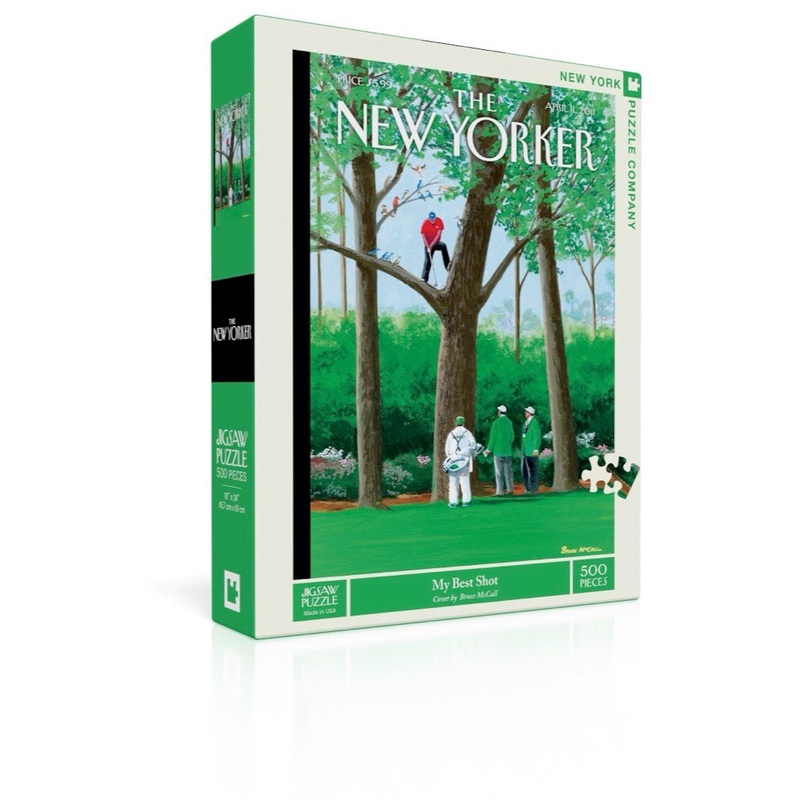 A group of onlookers, including a flock of birds, watch a golfer give it his best shot as he drives his ball from a tree.New Yorker Cover by Artist Bruce McCall, originally published on April 11st, 2011500 Piece Jigsaw PuzzleFinished Puzzle Size: 18"x24"Li
