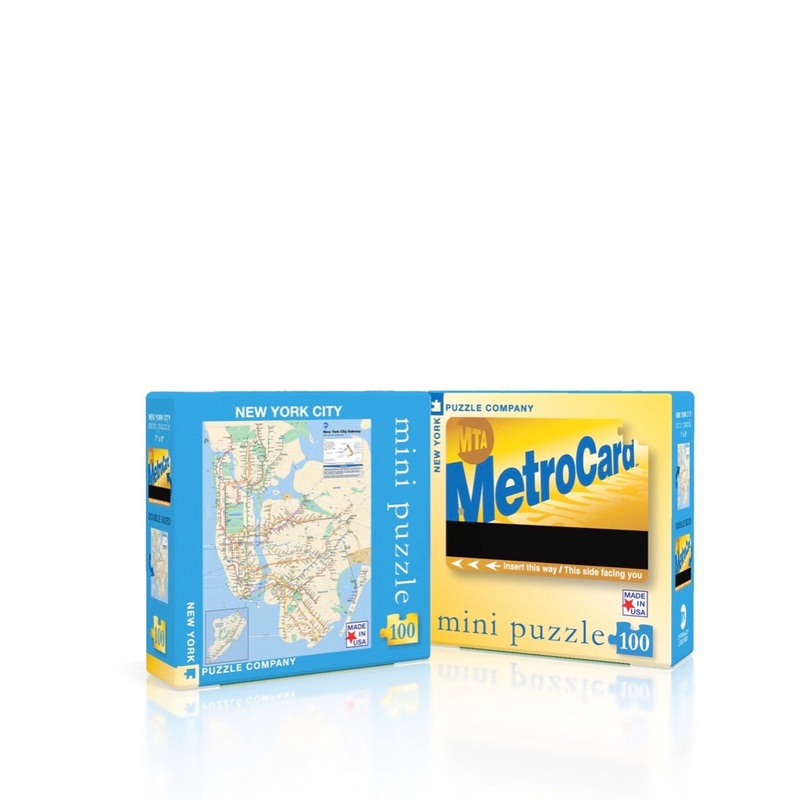 Double sided mini puzzle with a map of the NYC Subway on one side and an image of their iconic Metro card on the other.New York Subway Map100 Piece Jigsaw PuzzleFinished Puzzle Size: 7"x9"Linen Style Finish to reduce glareMade in USARecommended Age: 10+ Ye