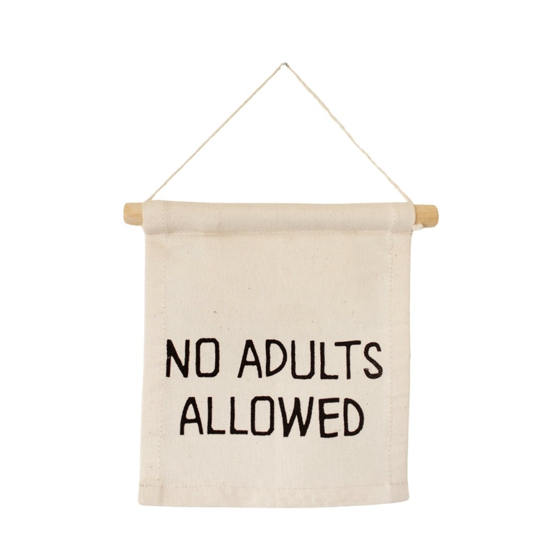 d e s c r i p t i o n"No adults allowed" hang sign on natural canvas with a poplar wooden dowel.Sewn andscreen printed by hand on natural canvas by empowered artisans in Mombasa, Kenyas p e c s+ black screen print on natural canvas+ poplar dowel rod and co