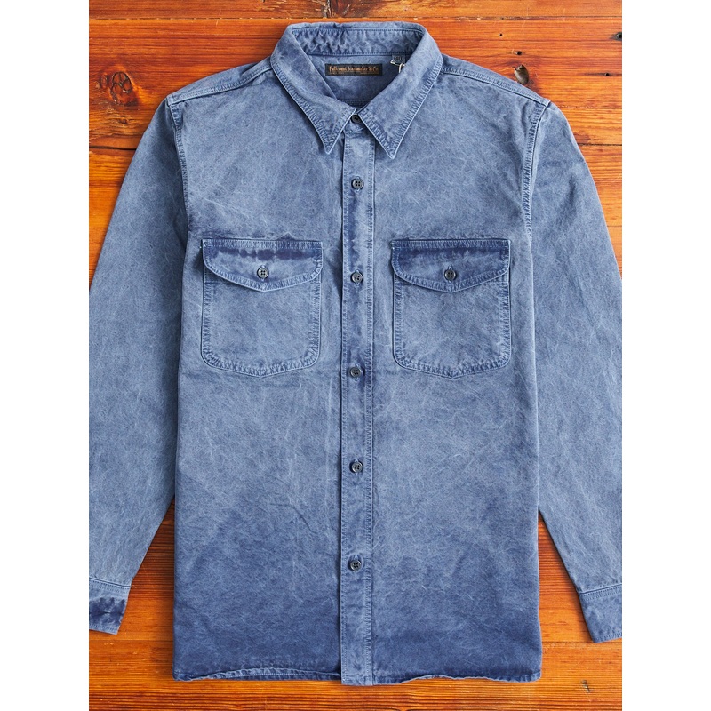 • The 4076Work Shirt from Fullcount is made using the brand’s custom weave work twill fabric in a classic button-up silhouette. Utilizing fine-count yarn in combination with a high-density weave, the shirt sports asmooth texture with a substantial medium-weight heft. Shuttle woven and sewn on vintage American sewing machines for time-accurateconstruction, the shirt features an in-house garment dye enzyme wash process giving the shirt the feel and appearance of a time-worn garment. Modeled after 1940’s work shirts, the chambraycomes finished with two large chest pockets, period correct urea buttons, and vintage stitched reinforcement.