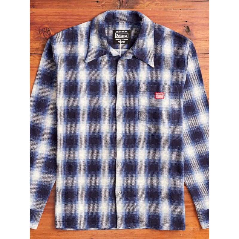 • Cherished for their beautiful fabrics and detail-oriented construction, Samurai’s shirtingis crafted with the same level of expertise as the brand’s denim. The Samurai Work Clothes line focuses on contemporary American workwear utilizing the brand’s extensive fabric archives and Japanese construction. Built tough, this shirt is constructed using amedium-weight brushed flannel fabric woven using thick cotton yarn for a substantial heft. Thisinstallment is cut in a regular fit and features open snap-buttons, straight hem, and singleutility chest pocket.