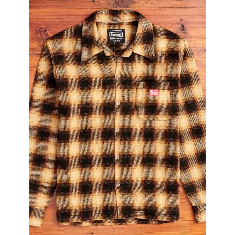 • Cherished for their beautiful fabrics and detail-oriented construction, Samurai’s shirtingis crafted with the same level of expertise as the brand’s denim. The Samurai Work Clothes line focuses on contemporary American workwear utilizing the brand’s extensive fabric archives and Japanese construction. Built tough, this shirt is constructed using amedium-weight brushed flannel fabric woven using thick cotton yarn for a substantial heft. Thisinstallment is cut in a regular fit and features open snap-buttons, straight hem, and singleutility chest pocket.