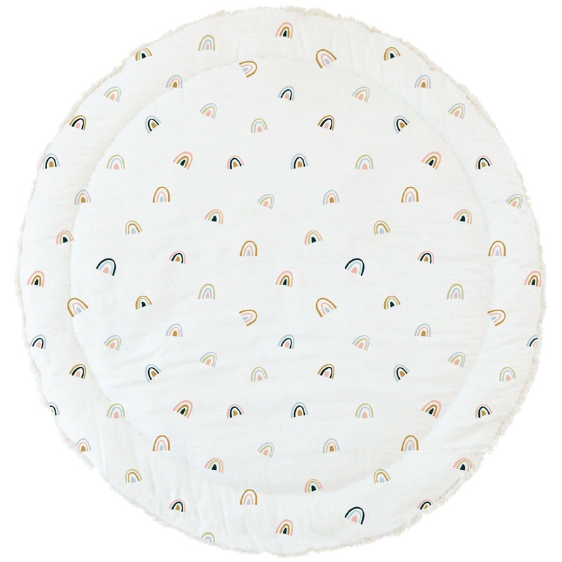 Beautiful and Made Of The Softest GOTS Certified Organic Cotton. Reversible Playmat that changes the scene to match your mood. Quilted In Gorgeous Diamond Pattern in solid color on one Side and playful rainbowson the other. Our thick quilted Play Mats Are