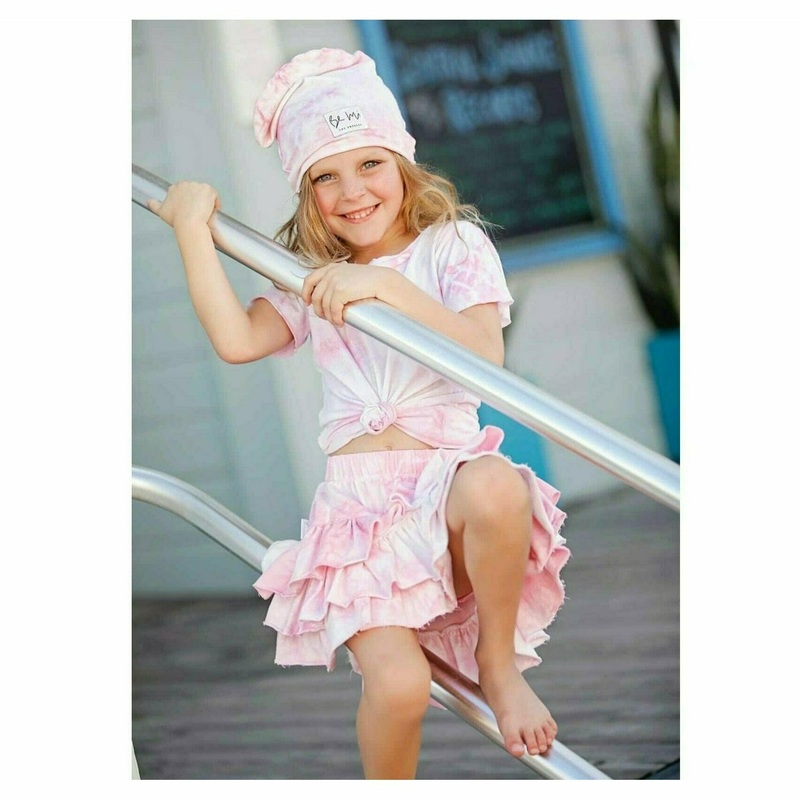 Gigi asymmetrical ruffle skirt in our custom marble tie dye will quickly become your aspiring fashionistas go-to piece for school or play. Perfect for back-to-school moments. Featuring the all time favorite asymmetrical, tiered ruffles, elastic waistband a