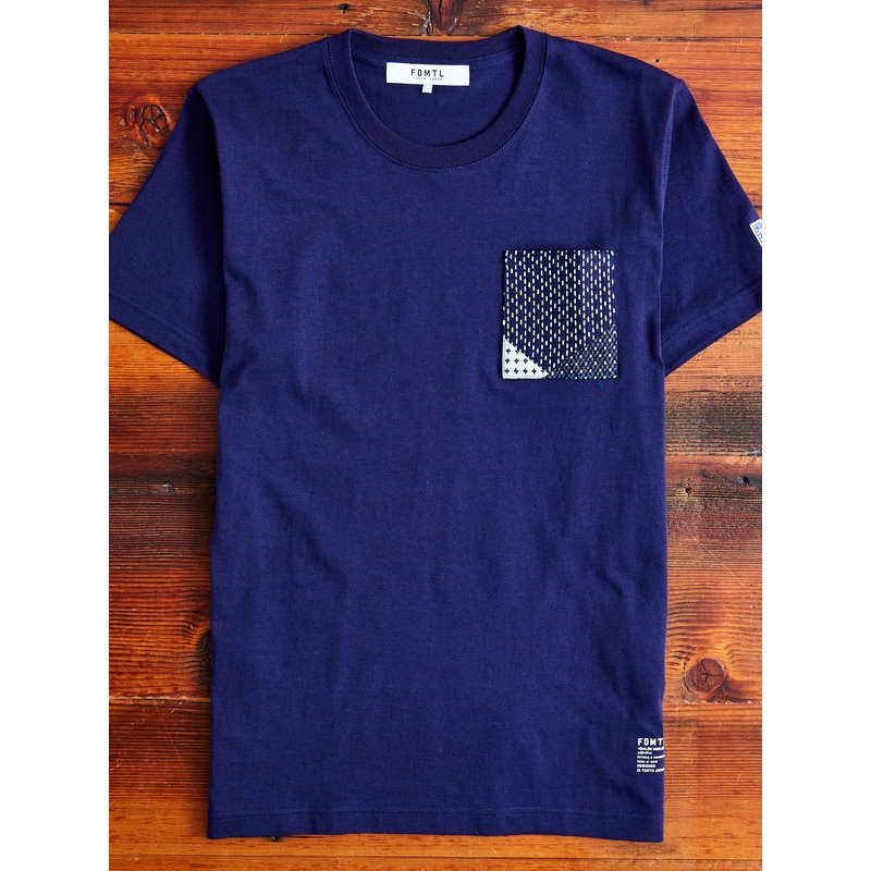 • The Origami pocket t-shirt from FDMTL features an indigodyed jersey fabricwith signature embroidery details. Dyed in indigo for a rich blue color, the shirt is cut with a rounded hem for a modern silhouette, and features a unique patchwork style origami chest pocket as an homage to the brand’s boro repair roots.