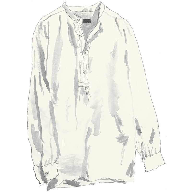 (A dozen pleats on either side of the four-button front placket, gathers at the back yoke and cuffs. Faintly swashbuckling.)Imported.