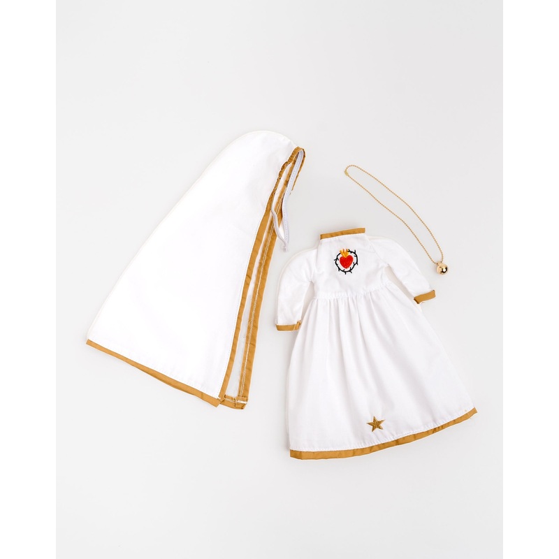 This outfitkit includes: 1 white dress with the Immaculate Heart of Mary embroidered, edged with Gold, 1 white veil edged with Gold, 1 beaded necklace to symbolize the rosary she carried, a Fatima booklet, and a canvas carrying bag. Please note that this does not include the Mary doll.