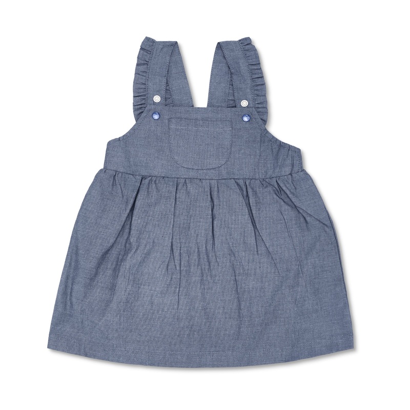 100% organic chambray cotton Dark indigo wash Elastic waist and ruffled cross-back straps Functional front pocket Machine wash, tumble dry