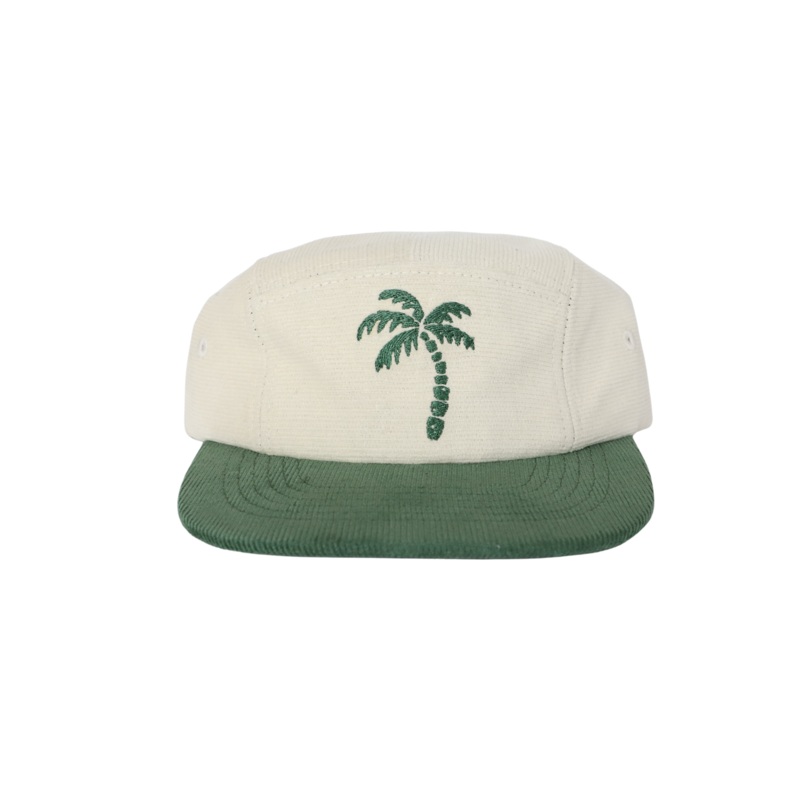 A two-tone corduroy hat with an embroidered palm tree and the perfect palm green to match.