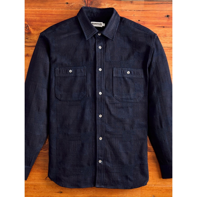 • This button-down from Momotaro features an indigo-dyed jacquard weave patchwork check design inspired by traditional sashiko fabrics. Dyed a deep indigo, the shirt will continue to transform with continued wear. Featuring two chest pockets at the front, mother of pearl buttons, and double-needle stitching throughout.