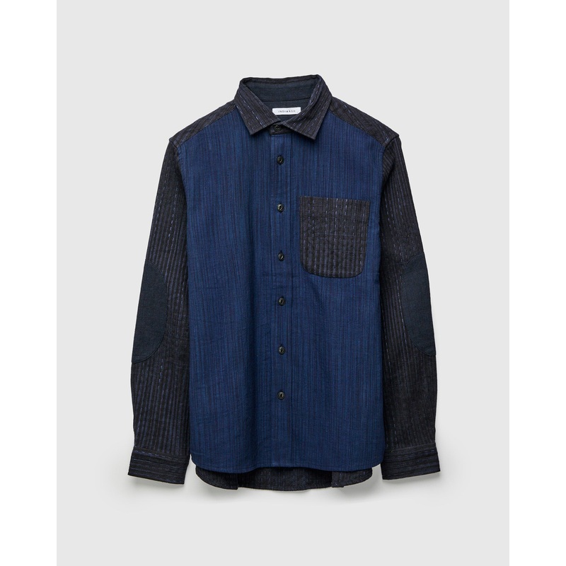 • The Matty Overshirt from Indi + Ash is cut in a comfortably relaxed fit that can be layered and worn like a jacket. Crafted from a patchwork of naturally dyed handwoven fabrics, this iteration features a handspun patchwork runner stitch cloth and textured handwoven canvas fabric. Dyed using indigo and iron in a space dye technique, all yarns feature an organic visual texture that will continue to fade and transform overtime. Finished by a single tailor the shirt comes sewn with tonal detailing, french seams, elbow patches, and single chest patch pocket.