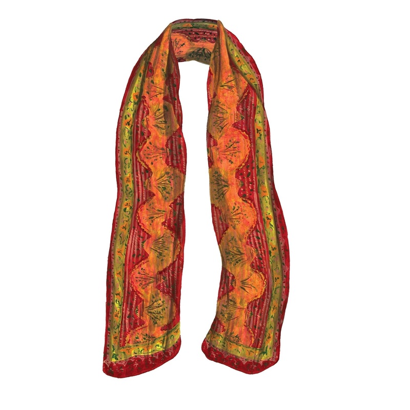 Payal Silk Stole (No. 5930). Pure silk crinkle georgette. 20 ” W x 69″ L. Equally unforgettable as a stole or wrapped around like a scarf. Red, fiery orange, and olive placed jacquard print. Keeps you out of the shadows. Made in India.