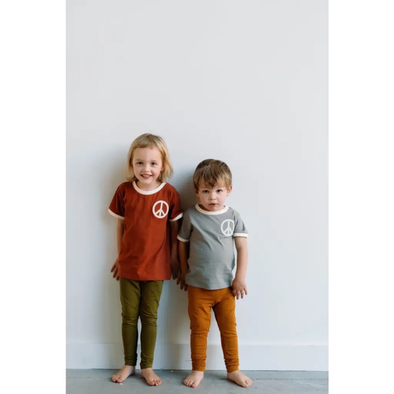 Not your basic everyday ringer tee, this retro-inspired shirt is a staple for any kiddo's collection.Chainstitch embroidered with a peace sign on the left chest, this lightweight and cozy neutral is perfect for all seasons.Here are some fun facts:Made with