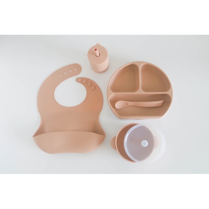 All of ourmeal sets come with a matching plate, spoon, bowl, bib and straw cup so your babycan look stylishwherever you are! The bowl and plate both come with a silicone lid!