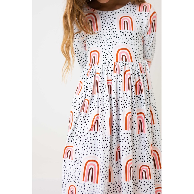 The perfect dress for school, special occasions, and everyday play! Designed by a mom and a dad. Mom wanted something twirly, comfortable and easy to wash. Dad wanted something easy to get on his chubby, big headed toddler. Designed with a scoop back for quick on and off, and higher neckline for modesty. Pair with Twirl Shorts or Leggings for the perfect everyday outfit. Mix and Match our Peach Rainbow print collection for sisters, cousins, or BFFs.