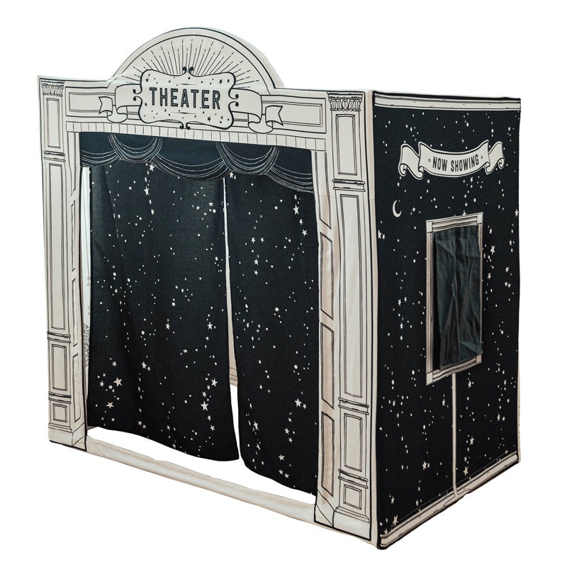 Whether your little one is an aspiring actor, singer, or dancer, they will take a bow in our Performance Stage. Easy set up and ready to change out the included background scenes. One side is a room setting which reverses to a forest scene. Includes an pretend microphone with stand. Write in the title of the performance on the chalk cloth window, or change the hanging side curtain to closed/open. Roll up back door, functional front curtains, and lots of fun graphics. All the world is a stage!