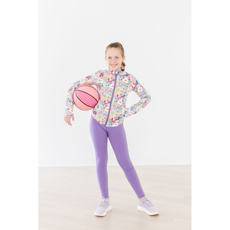 Its finally here! An active line made for dance, cheer, yoga workouts or just lounging at home. She will love the little details of this jacket like the ROSE on the zipper, thumbholes, and the ruffle on the back. And it has pockets! The line is made to mix