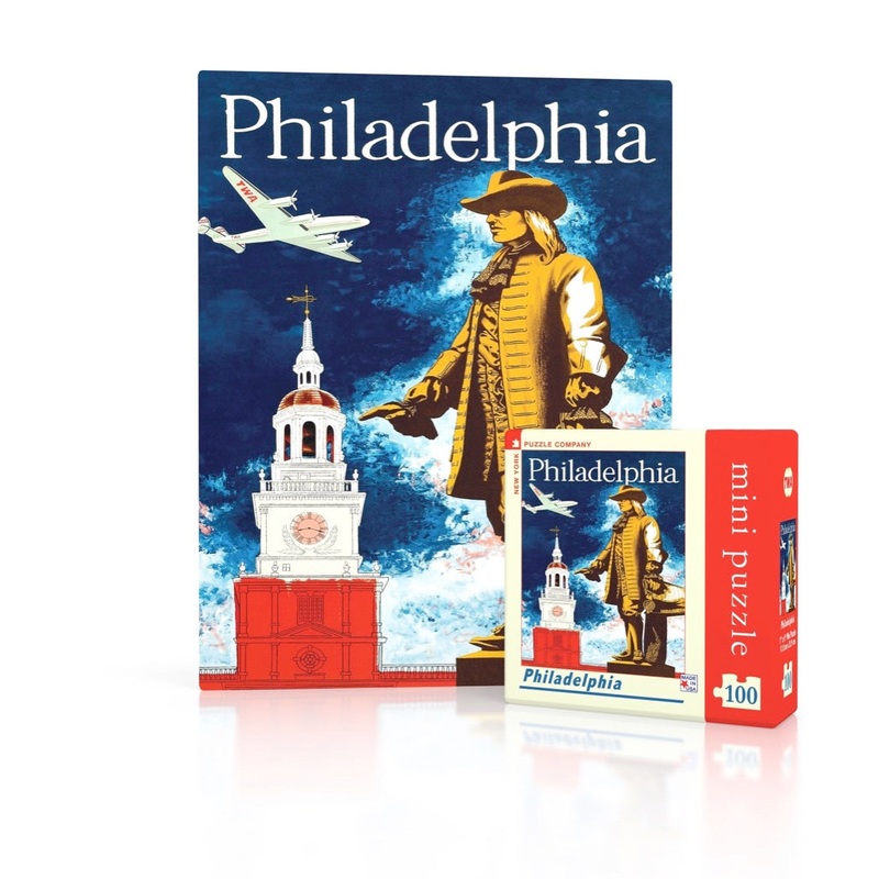 From a vintage travel poster, a TWA propeller plane flies over a large statue of Benjamin Franklin and Independence Hall.