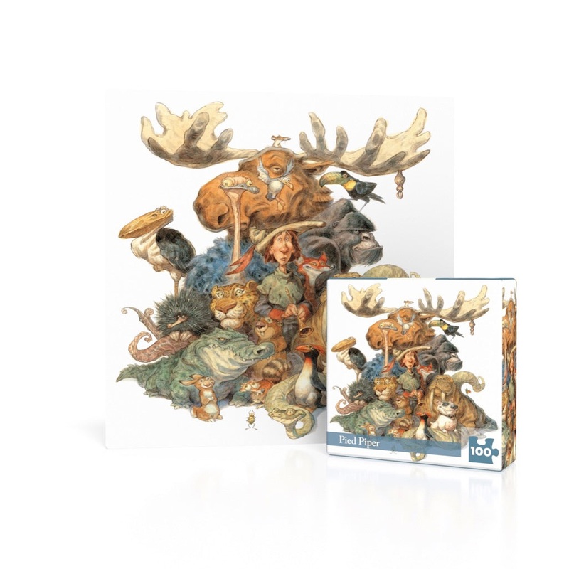 In this hilarious scene illustrated by Peter de Sve, the Pied Piper finds himself with more than he bargained for as a wide array of interesting and intimidating animals follow his tune. The comical expressions of his chaotic parade have now left him wondering, “Now what?” This delightful 100 piece puzzle is perfect for those who enjoy a good laugh while piecing together an imaginative and detailed work of art.