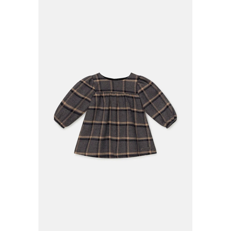 This plaid baby dress features a crew neck, puffed sleeves, and elastic cuffs. Gathered seam at the top for added volume with a decorative bow.